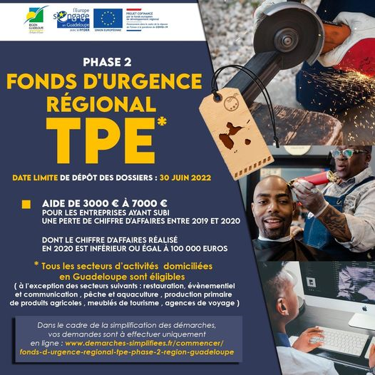 Depuis 2020, les entreprises subissent les conséquences financières de la crise sanitaire due à la pandémie de Covid-19. Cette situation qui perdure sur notre territoire vient affecter un tissu économique composé de très petites entreprises dynamiques, déjà fragilisées par les contraintes spécifiques de notre région. La Région Guadeloupe accompagne, avec le soutien financier de l’Europe, les entreprises faisant face à des difficultés dans le contexte de crise sanitaire, à travers la création d’un dispositif intitulé « Fonds d’urgence régional TPE – Phase 2 »