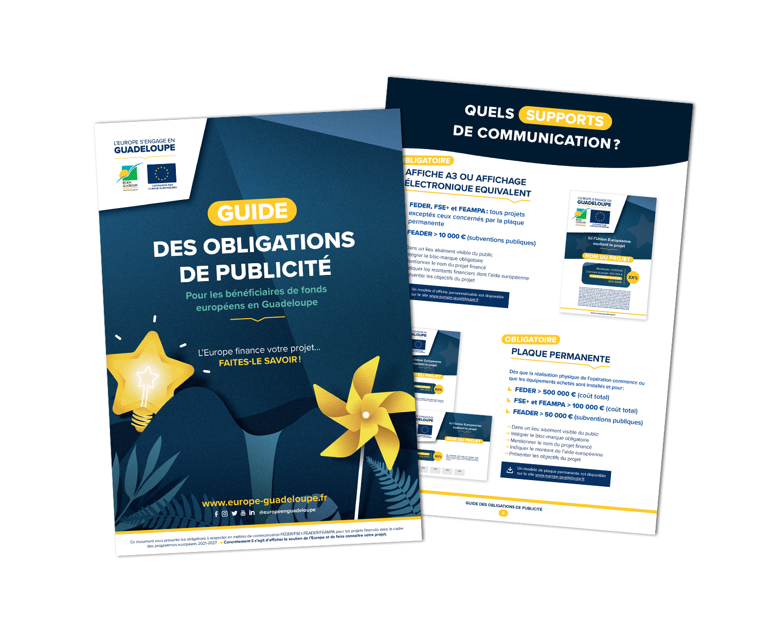 Téléchargez les modèles des supports de communication. Ils constituent une présentation conforme aux règlements européens et aux obligations de publicité de l’Europe et de la région Guadeloupe, autorité de gestion des programmes européens sur le territoire.